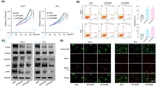 siRNA-mediated knockdown of ITGA3 suppresses tumorigenic phenotypes and induces apoptosis in HCC cell lines. (A) Proliferation assay after ITGA3 siRNA transfection. (B) Annexin V apoptosis assay in rHuh-7 and rPLC after ITGA3 knockdown. ITGA3 knockdown significantly increased apoptosis rates compared to control siRNA (siNC). (C) Western blot analysis showing decreased ITGA3 expression and inhibition of the EGFR–AKT signaling pathway following ITGA3 knockdown in rHuh-7 and rPLC. GAPDH was used as an internal control. (D) Representative images of anoikis assays in rHuh-7 and rPLC after ITGA3 knockdown. Calcein AM was used to stain viable cells (green), and EthD-1 was used to stain dead cells (red). Data represent mean ± SD (* p < 0.05 vs. control). (See also Figure S1 for functional assays demonstrating suppression of colony formation, migration, invasion, and stemness-related gene expression following ITGA3 knockdown).