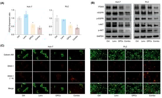OPCs restore anoikis sensitivity and overcome Lenvatinib resistance by targeting ITGA3 and inhibiting EGFR–AKT signaling. (A) qRT-PCR analysis of ITGA3 expression in rHuh-7 and rPLC cell lines treated with Lenv, OPCs, or the combination of both. OPCs treatment significantly downregulated ITGA3 expression at the mRNA level. (B) Western blot analysis showing the effect of treatments on ITGA3 expression and EGFR–AKT signaling pathway activation in rHuh-7 and rPLC. OPCs and the combination treatment suppressed ITGA3 and the phosphorylation of EGFR, AKT. (C) Representative images from anoikis assays in rHuh-7 and rPLC treated with control, Lenvatinib, OPCs, or the combination. Calcein AM was used to stain viable cells (green), and EthD-1 was used to stain dead cells (red). Combination therapy restored anoikis sensitivity in both cell lines. Data represent mean ± SD (* p < 0.05 vs. control).