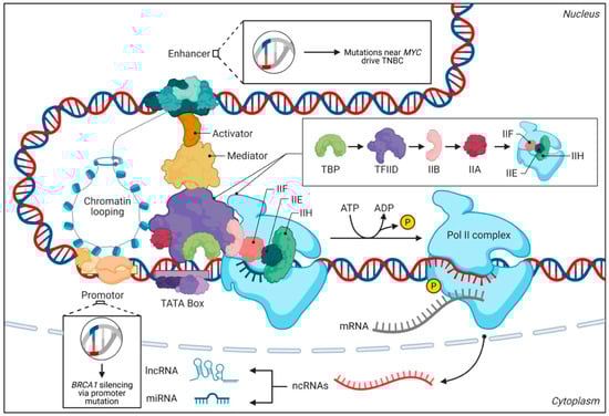 Transcriptional regulation and non-coding mutations in BC. This figure illustrates the complex molecular mechanisms of gene regulation and transcription in eukaryotic cells, highlighting how non-coding DNA elements influence cancer development. Non-coding DNA encompasses diverse elements such as enhancers, promoters, silencers, and ncRNAs. These elements exert precise control over gene expression by modulating transcription, RNA splicing, and chromatin organization. The diagram shows DNA with various regulatory elements and protein complexes involved in transcription. Enhancers, which are distal regulatory sequences, interact with promoters through chromatin looping to enhance transcription, as visualized in the top portion of the figure. The central area shows the assembly of the transcriptional apparatus, including the activator protein (brown), mediator complex (light tan), and promoter region with a TATA box motif. The right side displays the sequential assembly of basal transcription factors (TBP, TFIID, IIB, IIA, IIE, IIF, and IIH) forming the pre-initiation complex, leading to RNA Polymerase II (Pol II) activity. In BC, mutations within these non-coding regions can disrupt intricate regulatory networks, as illustrated by the two highlighted examples: mutations near the MYC oncogene that drive its overexpression in TNBC, contributing to tumor aggressiveness and chemoresistance, and mutations in the promoter region of BRCA1 resulting in its silencing, which impairs DNA repair mechanisms and fosters genomic instability. The bottom portion shows transcription products entering the cytoplasm, including mRNA and ncRNAs that branch into long non-coding RNAs (lncRNAs) and microRNAs (miRNAs), which regulate gene expression at both transcriptional and post-transcriptional levels, influencing critical cellular processes like proliferation, differentiation, and apoptosis.