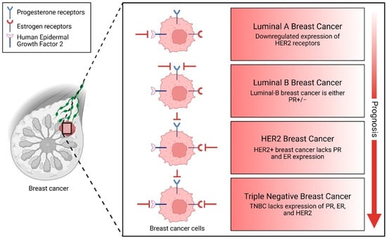 BCs are commonly classified into several subtypes based on the expression of hormone receptors and HER2. Luminal A BC is characterized by the absence of HER2 expression. Luminal B BC may be either positive or negative for progesterone receptors (PR). HER2-positive BC typically lacks both progesterone (PR) and estrogen receptor (ER) expression. TNBC is defined by the absence of all three markers: PR, ER, and HER2.