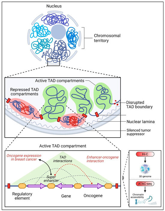 Chromatin architecture and its role in gene regulation and BC. The spatial organization of the genome within the nucleus is structured into chromosomal territories and subdivided into topologically associating domains (TADs). TADs are genomic regions with high internal chromatin interactions and are classified as either active compartments (green) or repressed compartments (pink). This 3D organization ensures precise enhancer–promoter interactions within the same TAD. In cancer, disrupted TAD boundaries may lead to the mislocalization of enhancers, resulting in aberrant oncogene activation or tumor suppressor silencing, as shown in the middle panel. The zoomed-in view depicts an active TAD compartment, highlighting super-enhancers that drive oncogene expression in BC through abnormal chromatin looping. On the right, tools like Hi-C (3D genome mapping) and ATAC-seq (chromatin accessibility profiling) are shown, which help decode genome organization and enhancer landscapes in cancer research.