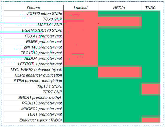 Heatmap of non-coding mutations across BC subtypes. The heatmap illustrates the presence of specific non-coding mutations across three major BC subtypes: Luminal, HER2+, and TNBC. Each row represents a unique regulatory mutation or region, while each column corresponds to a cancer subtype. Color intensity reflects the presence of mutations, with deeper red shades indicating confirmed involvement of that mutation in the corresponding subtype. Data were curated from peer-reviewed genomic studies, including germline variants, somatic promoter/enhancer mutations, and structural regulatory alterations linked to subtype-specific gene expression patterns and tumor progression.