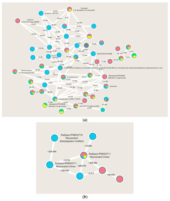 WGSs are highlighted as rich in flavonoids, which are polyphenols biosynthesized through the phenylpropanoid pathway. Specifically, these putatively identified metabolites are related to the flavanol biosynthesis pathway. The recognition of this metabolic pathway is significant as it indicates the quality of the raw material used to produce these extracts. In white grapes, flavonoids play a crucial role in conferring flavor to the final product and are directly correlated with specific grape cultivation techniques [24]. Of particular interest is the molecular cluster of resveratrol, present in monomeric, dimeric, and trimeric forms (Figure 1b). Resveratrol is a stilbenoid known to be present in various grape varieties and recognized for its diverse biological activities, such as anti-proliferative, antiviral, neuroprotective, anti-inflammatory, and anti-aging effects [25].