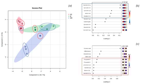 Observing the loading plot of component 1, a similar trend between the WE and IE samples emerges. Specifically, as shown in Figure 2b, the metabolites kaempferol 3-glucuronide, myricetin 3-glucoside/galactoside, quercetin 3-glucoside/galactoside, tartaric acid, and peonidin 3,5-diglucoside are characteristic of component 1. These metabolites are abundant in the IE, significant in the WE, and scarce in the HE.