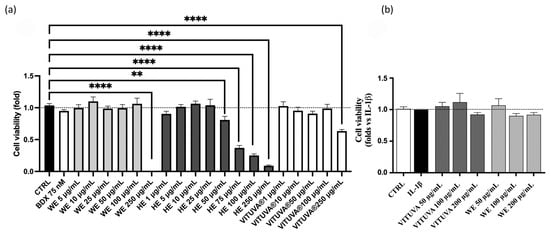 Cell viability of the extracts, measured by MTT assay in HEK293T (a) and GES-1 (b). Data are expressed as mean ± S.E.M. Statistical analysis was calculated by one-way ANOVA with Bonferroni’s multiple comparison test (** p < 0.01, **** p < 0.0001 vs. CTRL).