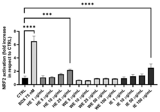 Antioxidant activity of HE, WE, and IE samples in HEK293T cell line with a gene reporter for Nrf2. Bardoxolone (BDX) is the positive control. Data are expressed as mean ± S.E.M. Statistical analysis is performed by one-way ANOVA with Bonferroni’s multiple comparison test (*** p < 0.001, **** p < 0.0001).