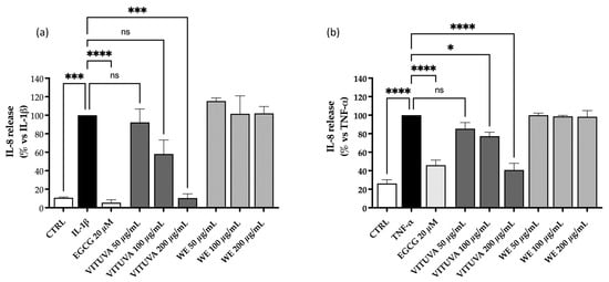 Effect of the WE and IE on the release of IL-8. The activity of the WE and IE is compared in GES-1 cells stimulated by IL-1β (a) or TNF-α (b). Calculated IC50 values of the IE were 101.5 µg/mL and 123.1 µg/mL, respectively. Data are expressed as mean ± S.E.M. Statistical analysis was calculated by one-way ANOVA with Bonferroni’s multiple comparison test (* p < 0.05, *** p < 0.001, **** p < 0.0001 vs. stimulus, ns = not significant).