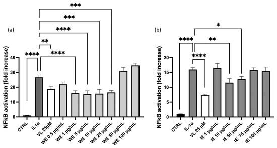 Effect of WE and IE on the NF-κB driven transcription. The activity of WE (a) and IE (b) is compared in HEK293Tstimulated by IL-1α. Data are expressed as mean ± S.E.M. Statistical analysis was calculated by one-way ANOVA with Bonferroni’s multiple comparison test (* p < 0.05, ** p < 0.01, *** p < 0.001, **** p < 0.0001).