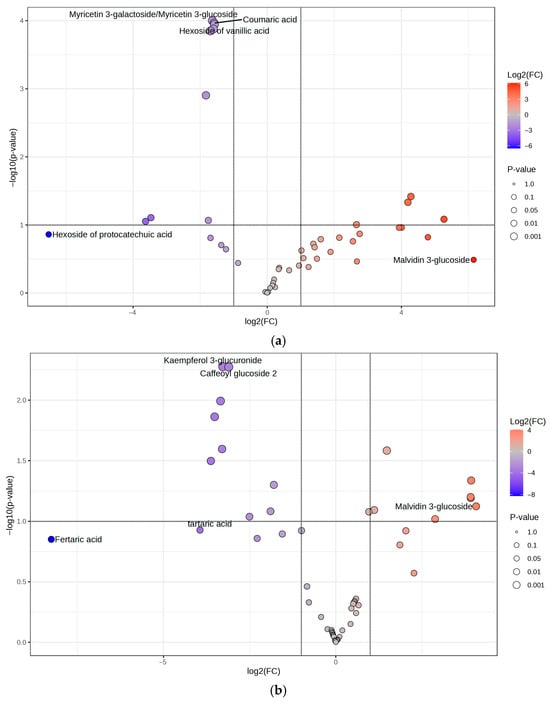 Volcano plots are generated using MetaboAnalyst to explore the phytocompounds in IE and their correlation with the mechanism of action. (a) Volcano plot comparing IEs and WEs; in red, the polyphenolic metabolites are more abundant in IE, and in blue, those more abundant in WE. (b) Volcano plot comparing HE and IEs; in red, the polyphenolic metabolites are more abundant in HE, and in blue, those are more abundant in IEs.