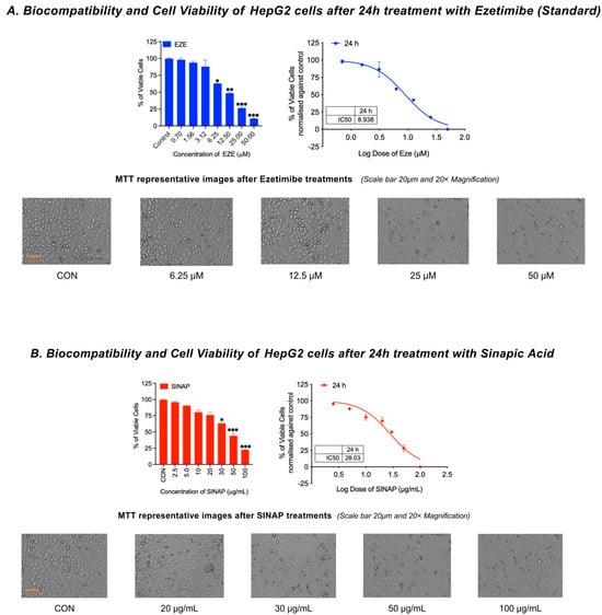 (A) Cell viability of HepG2 cells after 24 h of treatment with ezetimibe (standard), and (B) biocompatibility and cell viability of HepG2 cells after 24 h of treatment with sinapic acid. * p < 0.05, ** p < 0.01, *** p < 0.001 compared with control (CON).