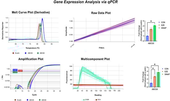 To evaluate the regulatory effect of sinapic acid (SINAP) on genes associated with cholesterol transport, the mRNA expression levels of ABCG5 and ABCG8 were assessed in the HepG2 cells through quantitative real-time PCR (qPCR). The cells were treated with SINAP (50 μg/mL) and the reference drug ezetimibe (25 μM). Total RNA was isolated and reverse-transcribed, and the gene expression was normalized to β-actin (ACTB) as an internal control. Relative quantification was performed using the 2−ΔΔCt method, and the results are expressed as the fold change relative to the untreated control (n = 3, mean ± SD). The fold changes and statistical significance of ABCG5 and ABCG8 expression are presented in Table 2.