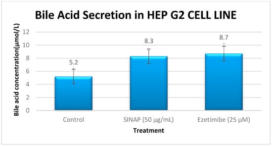 An ELISA was performed to assess the effect on bile acid production. In Figure 3, the bar graph represents the total bile acid secretion in the HepG2 cell culture supernatants after 24 h of treatment with the control, SINAP (50 µg/mL), and ezetimibe (25 µM). Bile acid levels were quantified using a Human Total Bile Acid ELISA kit. Both SINAP and EZE significantly increased the bile acid secretion compared to that in the control (p < 0.05). Values represent the mean ± SD from triplicate experiments. Each bar includes standard deviation error bars. Asterisks (*) indicate statistically significant differences (p < 0.05) compared to the control group. Treatment with SINAP (50 µg/mL) significantly increased the bile acid secretion 1.6-fold relative to that in the control (p < 0.05), a response comparable to that in the EZE-treated cells (1.7-fold). These results indicate that SINAP effectively stimulates bile acid production, an essential process in cholesterol solubilization.