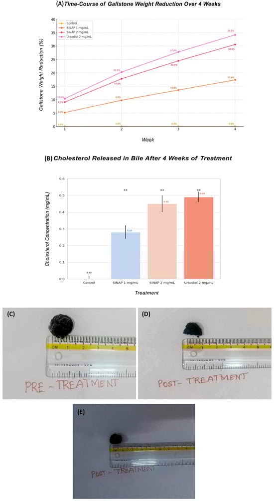 (A) Line and bar graphs showing gallstone weight reduction over time, and (B) cholesterol released into bile after treatment. (C) represents gallstones before treatment, and (D) shows SINAP-treated gallstones. (E) shows UDCA-treated gallstones. ** p < 0.01.