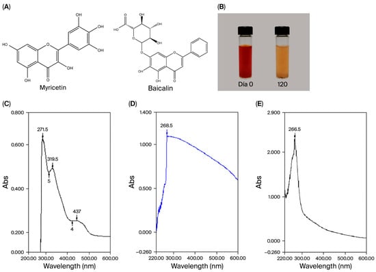 Chemical structure of Baicalin and Myricetin (A); stability over 170 days (B); UV–visible spectra of BSA (C), Se@BSA (D), BM (E), and BM/Se@BSA, n = 3.