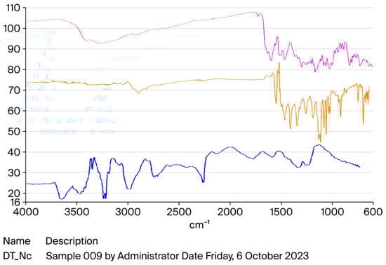 Results obtained using FTIR spectroscopy were employed to investigate the intermolecular interactions between flavonoids and nanoparticles (Figure 2 pink). Measurements were recorded across the spectral range of 400–4000 cm−1. The BM sample exhibited several characteristic absorption peaks: hydroxyl group at 3267 cm−1, carbonyl group at 1756 cm−1, and additional peaks at 2925, 1656, 1594, 1517, 1462, 1376, 1335, 1298, 1199, 1181, 1167, 1084, 1027, 830, and 722 cm−1. Key spectral assignments include: 3267 cm−1: OH stretching vibrations, 2925 cm−1: CH2 and aliphatic C–H stretching, 1756 cm−1 and 1656 cm−1: C=O stretching, typical of flavonoid structures, 1594 cm−1 and 1517 cm−1: Aromatic C=C stretching vibrations, indicative of benzene rings, 1335 cm−1: CH2-related stretching vibrations. 1199 cm−1 and 1027 cm−1: C–O stretching. Among these, the absorptions in 1756, 1656, 1462, and 1335 cm−1 are particularly characteristic of flavonoids (Figure 2 pink), confirming their interaction with nanoparticles.