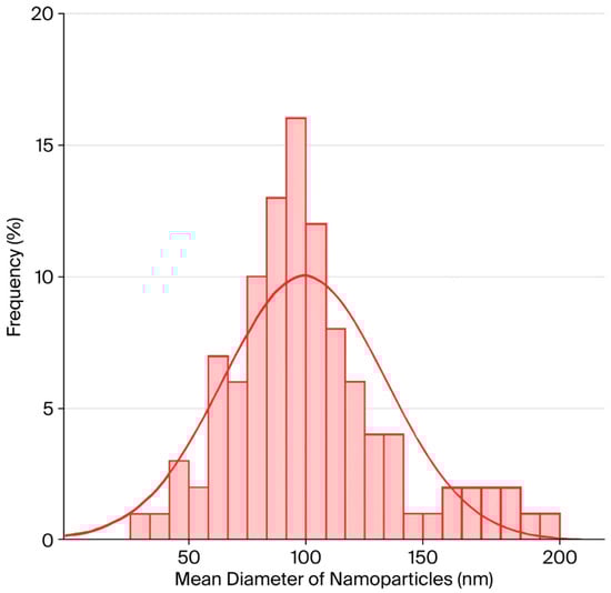 Additionally, the particle size distribution and the dispersion index of the nanoparticles revealed the distribution of droplet sizes, confirming their homogeneity. Sample, 3 mg of nanoparticles were analyzed using dynamic light scattering (DLS) at 25 °C. The laser attenuation filters were automatically adjusted during the measurements to optimize detection. This technique enabled determination of both the polydispersity index (PDI) and the average diameter of the nanoparticles. Particle size results were expressed as mean ± standard deviation [51].