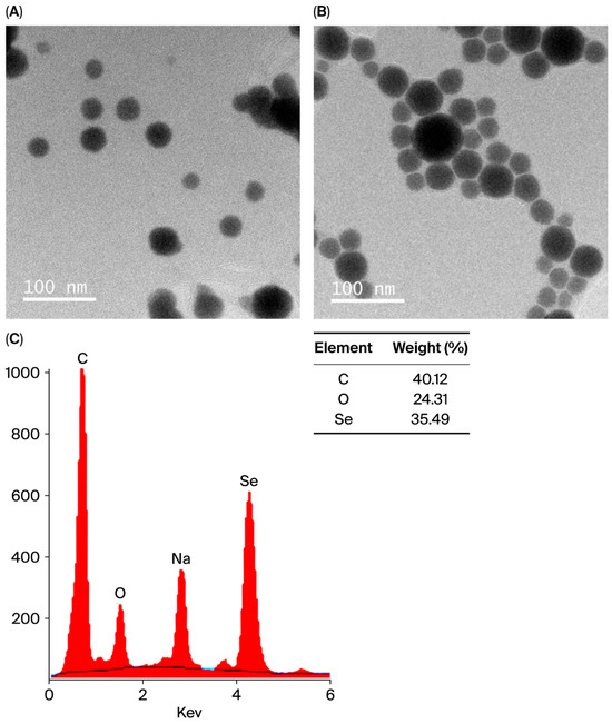 To verify the conversion of selenium ions to elemental selenium, an energy-dispersive X-ray (EDX) assay was conducted. A 1 mg sample was prepared following the same protocol used for transmission electron microscopy (TEM). The resulting TEM micrographs were subsequently analyzed using EDX (Waltham, MA, USA). The atomic percentages obtained through EDX provided insight into the elemental composition and purity of the synthesized nanoparticles [51].