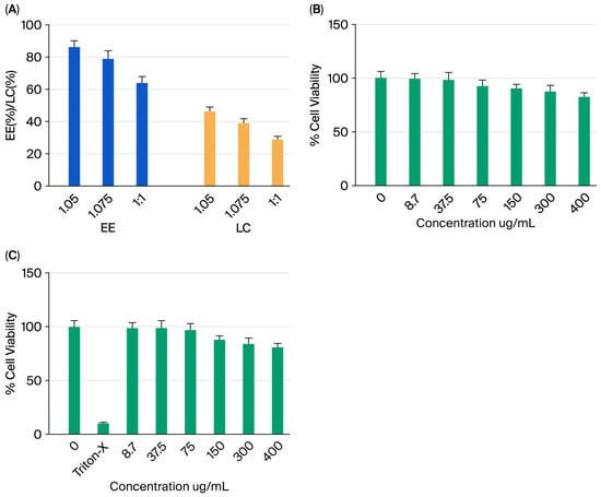 The percentage of BM encapsulated within selenium nanoparticles (NPs), known as encapsulation efficiency (EE), is associated with the ratio between BM and Se@BSA, which depends on the solubility of BM in the matrix material. In our study, the EE reached 88.7% for a ratio of 1:0.5, 79.8% for 1:0.75, and 69.2% for 1:1 (Figure 5A). The highest efficiency was observed at the selenium/BM ratio of 1:0.5. Notably, EE increases as the weight ratio of selenium to BM decreases. This improvement is due to BM saturation in the system, which prevents further adsorption by Se@BSA, causing excess BM to be rapidly released during centrifugation.