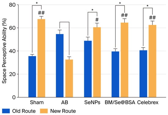 Effect of BM/Se@BSA on the T-maze test. Results are presented as mean ± SD (n = 8). Determination of abilities with old and new routes using Student’s t-test (* p < 0.05). Symbols indicated a statistically significant difference (# p < 0.05, ## p < 0.001).