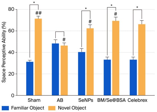 Effect of BM/Se@BSA on novel object recognition test. Determination of abilities in object recognition between familiar and novel objects. The spatial perceptive capacity assesses as the percentage of recognition interactions with each object above 5 min. Results are presented as mean ± SD (n = 8) and were analyzed using two-way ANOVA with Tukey’s test. * p < 0.05, # p < 0.05, ## p< 0.001 If groups share the same symbols, it means their differences are not statistically significant.