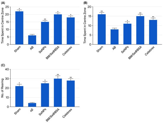 Effect of BM/Se@BSA in the open field test above 5 min: (A) minutes spent by mice in the center zone; (B) number of entries into the center in minutes; (C) number of line crossings, frequency of rearings. Results are presented as mean ± SD (n = 8) and were analyzed using two-way ANOVA with Tukey’s test. * p < 0.05, ** p < 0.01. If groups share the same asterisk, it means their differences are not statistically significant.