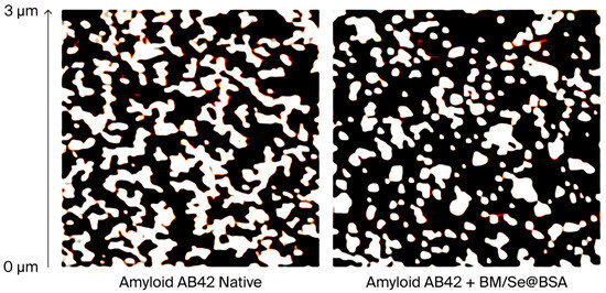Atomic force microscopy (AFM) was employed to assess the morphological changes in amyloid structures incubated with BM/Se@BSA, as shown in Figure 9. Amyloid β peptide (Aβ42) alone served as the control and exhibited characteristic fibrillation after 72 h of incubation, the control group showed the formation of small oligomers. In contrast, treatment with BM/Se@BSA markedly reduced oligomer content. These results indicate that BM/Se@BSA effectively inhibits amyloid oligomerization by forming complexes that interfere with their structural development.