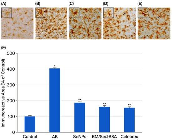 CD11b expression is closely associated with microglial activation during neurodegenerative inflammation. Therefore, microglial activation was assessed through CD11b immunoreactivity. Photomicrographs (Figure 10A–E) illustrate the presence of CD11b-positive microglia in the brain. Exposure to Aβ1-42 peptide induced notable morphological changes such as shortened, thickened processes and elongated branches resembling an amoeboid shape indicative of activated microglia. This activation led to an increased presence of CD11b-positive cells compared to the control group (Figure 10D). In contrast, mice treated with Celebrex, SeNPs, and BM/Se@BSA (administered at 10 and 30 mg/kg, respectively) exhibited significant suppression of microglial activation compared to the Aβ1-42 group (Figure 10E). The quantification of CD11b immunoreactivity in the cerebral cortex region is shown in the bar graph (Figure 10F).