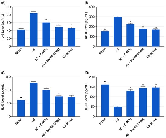Effects of BM/Se@BSA in the brain of Aβ1-42-treated mice om IL-6 (A); TNF-α (B); IL-1B (C); IL-10 (D) expressions in the brain of the mice. Values show mean ± SD, the asterisk indicates the significant difference from Aβ1-42 group at * p < 0.05, ** p < 0.01.