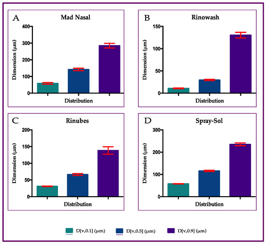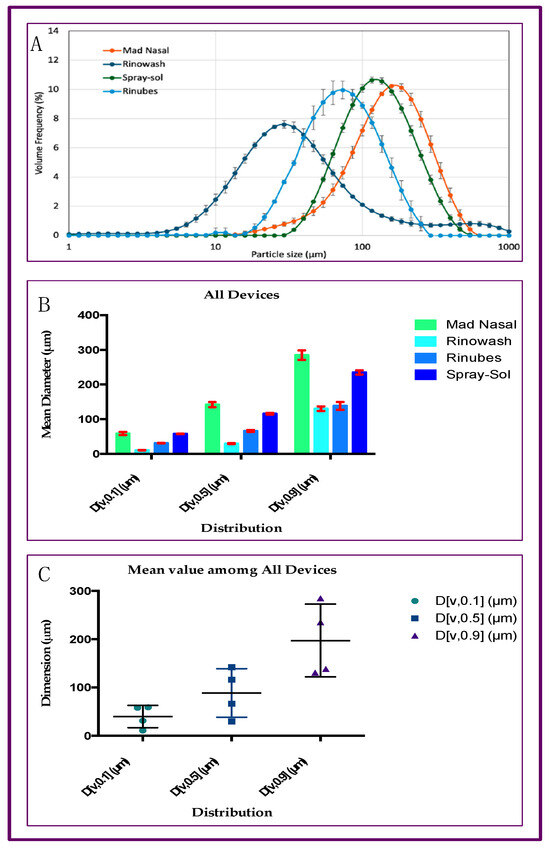 The FDA’s draft guidance recommends the use of laser diffraction to determine the droplet size produced for a given product. Laser diffraction systems, such as Malvern Spraytec, calculate the size of droplets by measuring the intensity of light scattered by particles as a function of angle. The applicable range according to ISO13320:2020 [46] is 0.1–3000 µm. The analysis allows the determination of an aerosol particle size distribution directly by spraying the cloud through the laser beam. D[v,0.5] is the Volume Median Diameter (VMD), which refers to the midpoint droplet size, where half of the volume of spray is in droplets smaller than the mean, and half of the volume is in droplets larger than the mean. The percentiles undersize D[v,0.1] and D[v,0.9], indicating the values of the corresponding diameters were, respectively, 10% and 90% of the droplet population. For the assessment, 3 mL of each drug was introduced into a 5 mL syringe connected to the nasal insufflator. The Rinowash device was filled with 3 mL and connected to a pneumatic aerosol therapy apparatus as reported in the leaflet. A content of a few vials equal to 10 mL was mixed in a beaker and 3 mL withdrawn for each analysis. In detail, the compressor employed was Pic AirFamily Solution (Pikdare, Como, Italy). Three measurements were performed for one insufflator characterization for durations of 5 s. In the case of Rinowash, the sampling period was 30 s in length.