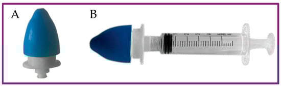 Representation of Rinubes. The Rinubes device has been meticulously designed to deliver a gentle and safe aerosol, ensuring maximum comfort for children’s delicate nasal passages. The distinctive aspect of this innovation lies in the precision of the aerosol cloud generated: the droplets have a uniform size, within a recognized range, to improve the product’s performance and efficacy. (A) Rinubes device; (B) configuration of Rinubes: association with the screw syringe for the administration of the pharmaceutical products for the treatment. Manufactured in Italy.