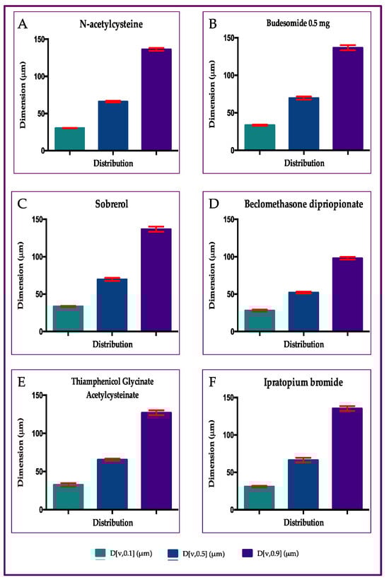 Analyses of dimension of particles from aerosol from Rinubes device: (A) N-acetylcysteine; (B) Budesonide 0.5 mg; (C) Sobrerol; (D) Beclomethasone dipropionate; (E) Thiamphenicol glycinate acetylcysteinate; (F) Ipratropium bromide.