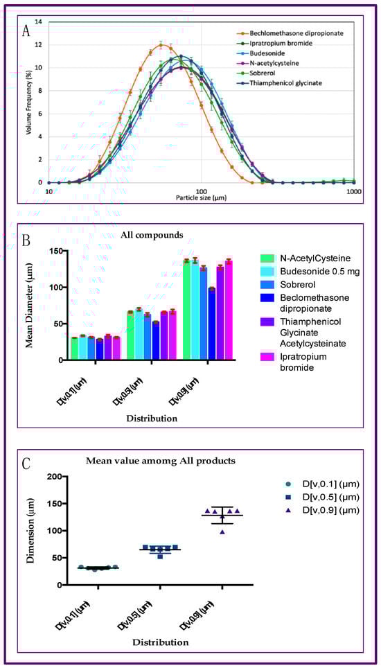 Cumulative analyses concerning the six API tested: (A) average and standard deviation results of size distribution for the six tested drugs with Rinubes; (B) ANOVA analyses of particle size distribution (PSD). (C) Graph plot representing the mean particle distribution among all products. No statistical difference was observed among the products (p > 0.05, while statistical difference was observed among the dimensions of size distribution.