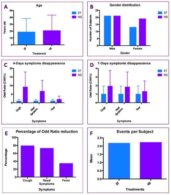 The ST group was considered the reference group, then the Odds Ratio (OR) concerning three parameters (i.e., cough, nasal symptoms and fever) was calculated. The ORs for symptom disappearance at day 4 were 9.18, 6.73 and 1.99 for the cough, nasal symptoms and fever, respectively (Figure 6C; p < 0.0001). The ORs for symptom disappearance at day 7 were 1.93, 1.94 and 1.31 (Figure 6D; p < 0.0001), for the cough, nasal symptoms and fever, respectively. Comparing the ORs in the NS group, a significant reduction of them was observed for the cough (−78.98%), for the nasal symptoms (−72.66%), but not for the fever (−34.18%; Figure 6E). The results indicate that NS therapy effectively reduces cough and nasal symptoms as early as day four, with a significantly higher OR compared to the control treatment. The NS treatment also shows up to two times greater efficacy on cough symptoms compared to the control treatment four days after starting treatment (Figure 6C). By day seven, the OR values decrease by up to 78% (Figure 6D) but remain in line with the OR observed for fever and still maintain a high ratio compared to the control treatment (Figure 6E). Finally, no difference in terms of symptoms per patient was observed (ST = 2.17; NS = 2.22). The data of NS treatment seem to indicate that the treatment affects the three symptoms investigated in an independent manner. No significant association among the age, gender or events per patient (Figure 6F) was found.