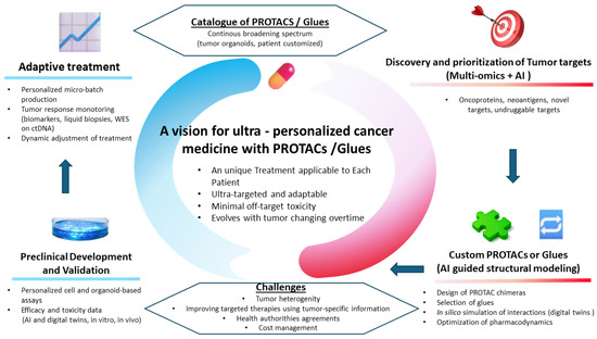 PROTACs are bifunctional small molecules that simultaneously bind a target protein and a component of the ubiquitin–proteasome system, thereby inducing selective degradation of the target. They represent a class of compounds capable of achieving the complete elimination of disease-relevant proteins. Molecular glues, by contrast, enhance existing surface complementarity between an E3 ligase and a target protein, promoting its ubiquitination and subsequent degradation. Both approaches are at the forefront of current efforts to overcome the long-standing challenge of undruggable tumor targets. In this context, AI-based strategies offer a powerful means to accelerate the discovery, optimization, and production of highly selective protein binders, streamlining access to potent degraders and maximizing therapeutic potential. These capabilities open new horizons for targeting a wide spectrum of previously inaccessible molecular pathways involved in cancer progression. Altogether, these advances position PROTACs and molecular glues as transformative agents for personalized oncology, particularly within the emerging paradigm of molecular tumor boards, where tailored therapeutic decisions and tumor-adapted drugs could be made rapidly accessible for a given patient.