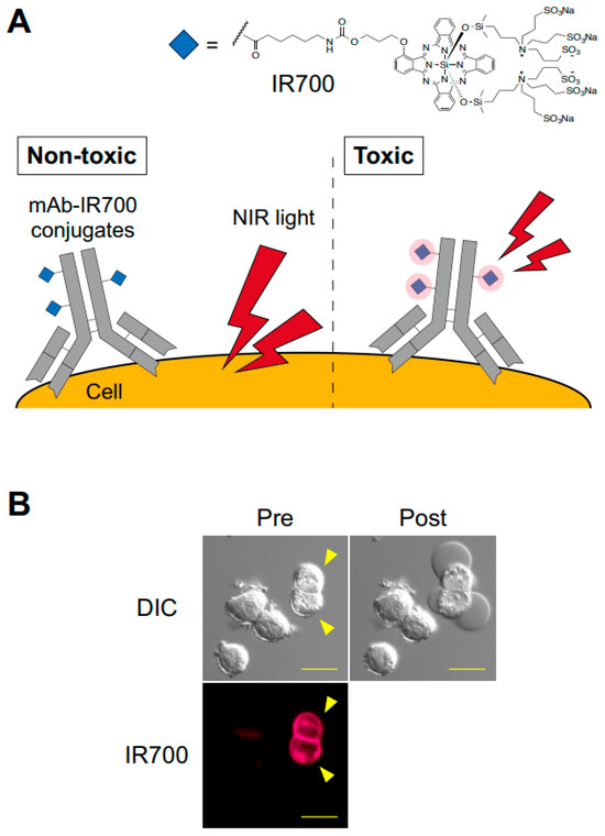 Overview of NIR-PIT. (A) NIR-PIT utilizes a photoabsorber (IR700)-conjugated mAb and NIR light. Monotherapy with NIR-PIT agents and NIR light is minimally cytotoxic. Cytotoxicity is induced specifically in agent-bound cells upon light irradiation. (B) Representative images of the highly selective cytotoxicity of NIR-PIT. Both targeting protein-expressing and non-expressing cells were co-cultured and treated with NIR-PIT agents. After NIR irradiation, cytotoxic effects were only induced in agent-bound cells (arrowhead).