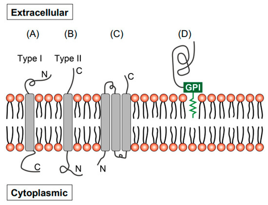 Schematics of membrane proteins. (A) Type I transmembrane, (B) type II transmembrane, (C) multipass transmembrane, and (D) GPI-anchored membrane protein.