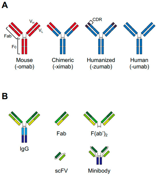 Schematics of the antibody type. (A) The structures of different types of monoclonal antibodies. (B) Antibody fragment types. CDR, complementarity-determining region; scFV, single-chain antibody variable fragment.
