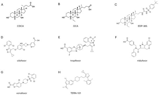 Structure of FXR agonists that are currently assessed in clinical trials. Chemical structures of (A) CDCA, (B) OCA, (C) EDP-305, (D) cilofexor, (E) tropifexor, (F) nidufexor, (G) vonafexor and (H) TERN-101 FXR agonists.