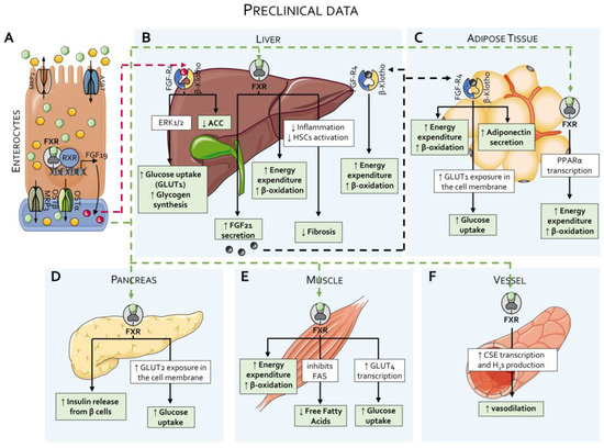 Effects of FXR agonists on lipid and glucose metabolism: preclinical data. (A) As detailed in Figure 2, approximately 90–95% of bile acids are reabsorbed by enterocytes from the intestinal lumen and returned to the portal circulation via specific transporters. In enterocytes, activation of FXR by primary bile acids induces the production of Fibroblast Growth Factor (FGF)-19 and enhances the activity of the OSTα/OSTβ transporter complex. (B) Through the portal circulation, bile acids and FGF19 first reach the liver. In the liver, FXR activation enhances energy expenditure and β-oxidation, suppresses inflammation and hepatic stellate cell (HSC) activation—thereby reducing liver fibrosis—and stimulates the production of FGF21. Hepatocytes also express the FGFR4/β-Klotho receptor complex, which binds FGF19 and promotes glucose uptake and glycogen synthesis via the ERK1/2 signaling pathway, while concurrently inhibiting acetyl-CoA carboxylase (ACC) activity. The same receptor complex binds FGF21, further enhancing energy expenditure and β-oxidation. (C) In white adipose tissues, FXR activation induces the transcription of PPARα, thereby increasing energy expenditure and β-oxidation. Adipose tissue also expresses the FGFR4/β-Klotho complex, which, upon binding to FGF21, elicits multiple metabolic effects, including increased energy expenditure and β-oxidation, enhanced glucose uptake via the glucose transporter protein type (GLUT) 1, and elevated adiponectin secretion. (D) In the pancreas, FXR activation promotes insulin secretion from β-cells and increases glucose uptake through the GLUT2 transporter. (E) In skeletal muscle, FXR activation enhances energy expenditure, β-oxidation, and glucose uptake via GLUT4, while simultaneously suppressing de novo synthesis of free fatty acids. (F) FXR also exerts vasodilatory effects in the vascular system by inducing hydrogen sulfide (H2S) production through the action of cystathionine γ-lyase (CSE).