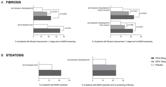Effect of obeticholic acid on liver fibrosis and steatosis from the REGENERATE and FLINT clinical trials. (A) The percentage of patients showing fibrosis improvement without NASH worsening increased in a dose-dependent manner in both clinical trials and was confirmed again in the REGENERATE re-analysis. (B) No significant differences in terms of NASH resolution (steatosis reduction) were highlighted among different OCA dosages among the clinical trials.