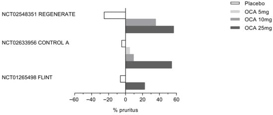 Several mechanisms have been suggested to explain why OCA causes itching. While none of the current hypotheses has been confirmed in dedicated clinical trials, the activation of Mas-related G-protein-coupled receptor member X4 (MRGPRX4), a G protein-coupled receptor (GPCR) for bile acids that is expressed on a subset of itch-sensing neurons, is gaining growing attention [90,91,92]. MRGPRX4 is activated by bile acids, and MRGPRX4 antagonists are currently proposed for treating pruritus in cholestatic diseases [90,91,92]. In vitro studies have shown that OCA binds and activates MRGPRX4 [92]. EP547, a selective MRGPRX4 inhibitor, is currently undergoing a phase 2 trial, designed to evaluate its safety, efficacy, and tolerability in subjects with PBC- or PSC-derived cholestatic pruritus [93]. An alternative explanation is that OCA might promote the release of IL-31, an FXR- regulated pruritogenic cytokine [94]. Serum IL-31 levels are also increased by cilofexor in NASH, PSC, and PBC patients who are treated with this FXR agonist, suggesting a potential explanation for itching caused by FXR ligands [94]. Additionally, it has been suggested [95] that OCA might activate GPBAR1, a pruritogenic receptor in mice [96]. However, this hypothesis has been abandoned, since GPBAR1 does not mediate the itching response to bile acids in humans [90].