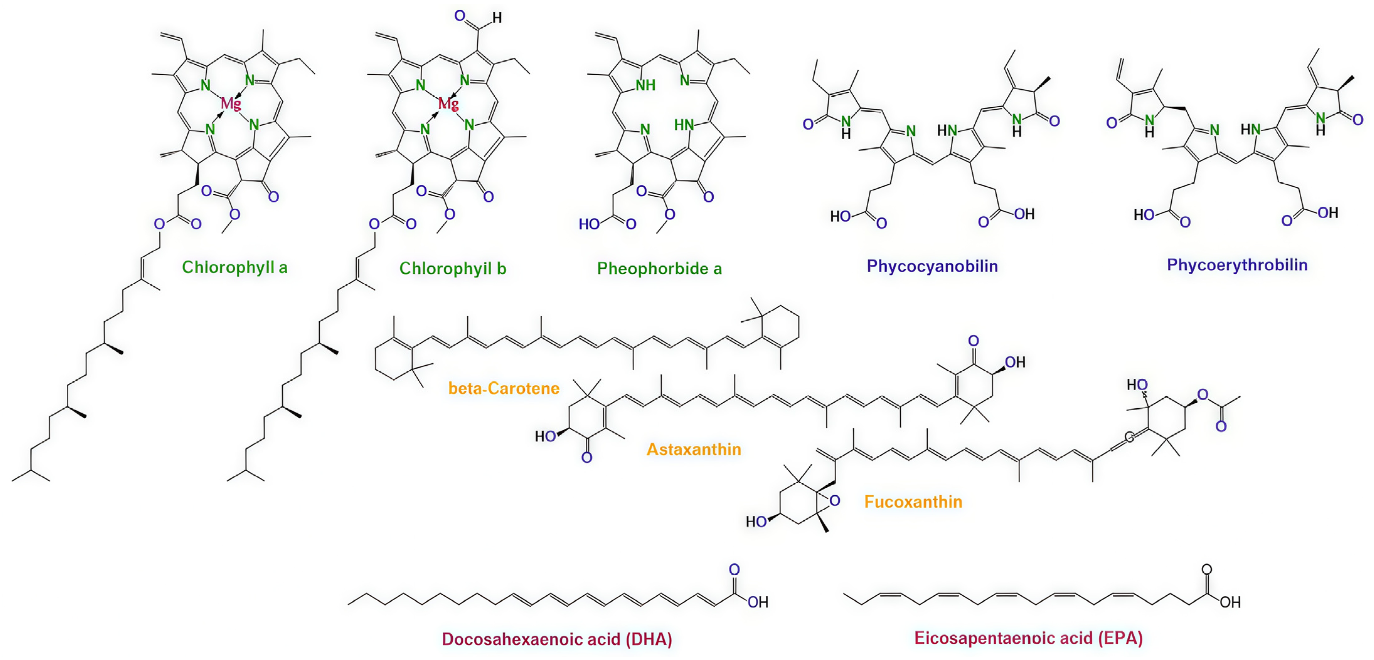 Representative chemical structures of microalgal pigments relevant to photodynamic therapy: chlorophyll a/b, pheophorbide a; carotenoids (β-carotene, astaxanthin, and fucoxanthin); phycocyanobilin (the chromophore of C-phycocyanin) and phycoerythrobilin (the chromophore of C-phycoerythrin); docosahexaenoic acid (DHA) and eicosapentaenoic acid (EPA) as a representative polyunsaturated fatty acid. Color coding is used to distinguish different classes of compounds: green—chlorophyll derivatives, orange—carotenoids, blue—phycobilin chromophores, and dark red—polyunsaturated fatty acids.