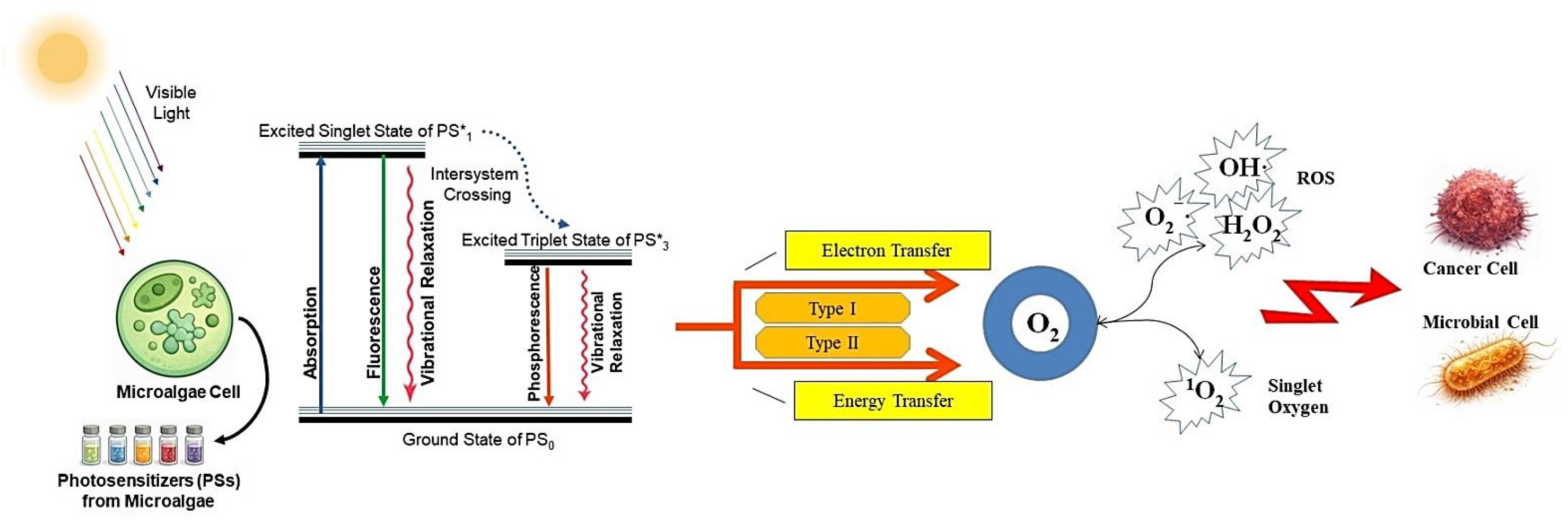 Upon absorption of light at appropriate wavelengths, microalgae-derived photosensitizers are promoted from the ground singlet state to an excited singlet state, followed by intersystem crossing to a long-lived triplet state. This excited triplet state can participate in two principal photodynamic pathways: Type I and Type II mechanisms (