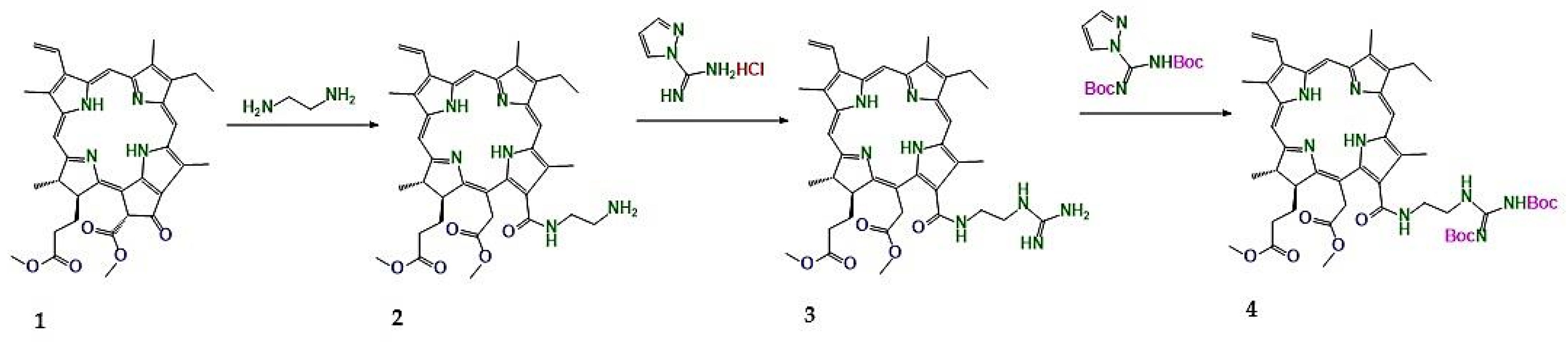 Schematic illustration of representative functional modifications of chlorin e6, including guanidine conjugation and side-chain derivatization, leading to enhanced photostability, increased reactive oxygen species generation, and improved photocytotoxicity of chlorin-based photosensitizers. (1) Chlorin e6. (2) Chlorin e6 modified via aliphatic diamine side-chain conjugation. (3) Guanidine-functionalized chlorin e6 derivative. (4) Boc-protected guanidine-functionalized chlorin e6 derivative.