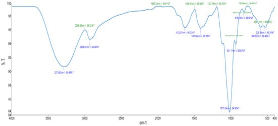 FTIR spectroscopy was employed to characterize functional groups on the plant extracts. Approximately 10 mg of the crude aqueous extract was blended with 100 mg of KBr to form a pellet, which was then mounted on a translucent disc for analysis using a Perkin Spectrum 100 FTIR spectrometer (Shelton, CT, USA). Spectral data were collected over a range of 400–4000 cm−1 with a resolution of 4 cm−1.