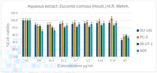 Dose-dependent antiproliferative effects of E. comosa methanol extract on DU-145, PC-3, SK-UT-1, and AGS cell lines. Cell viability is expressed relative to UC and DC. Data represent means ± SD of six concentrations per extract.