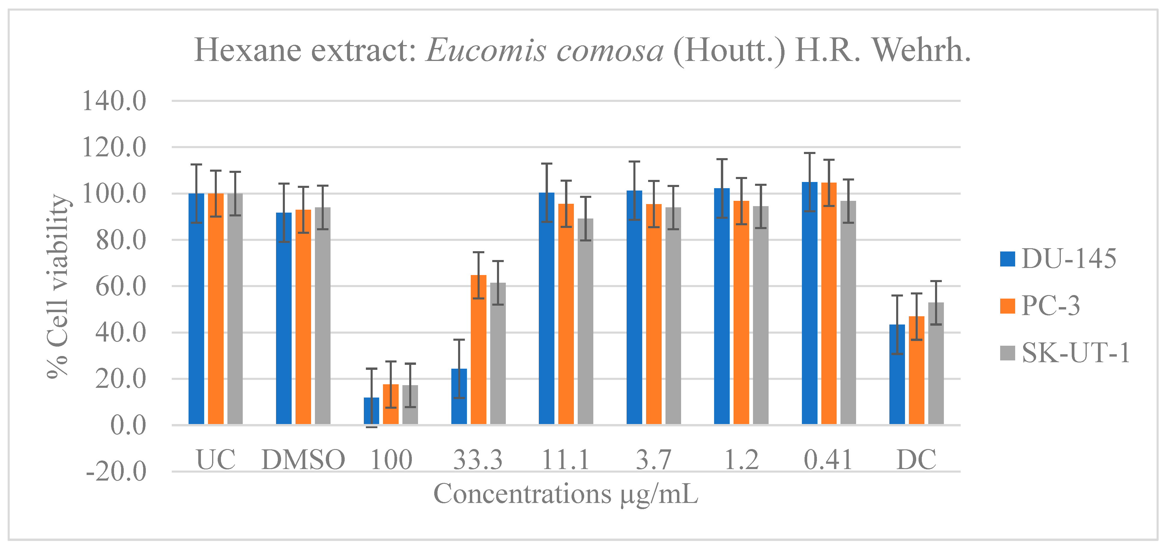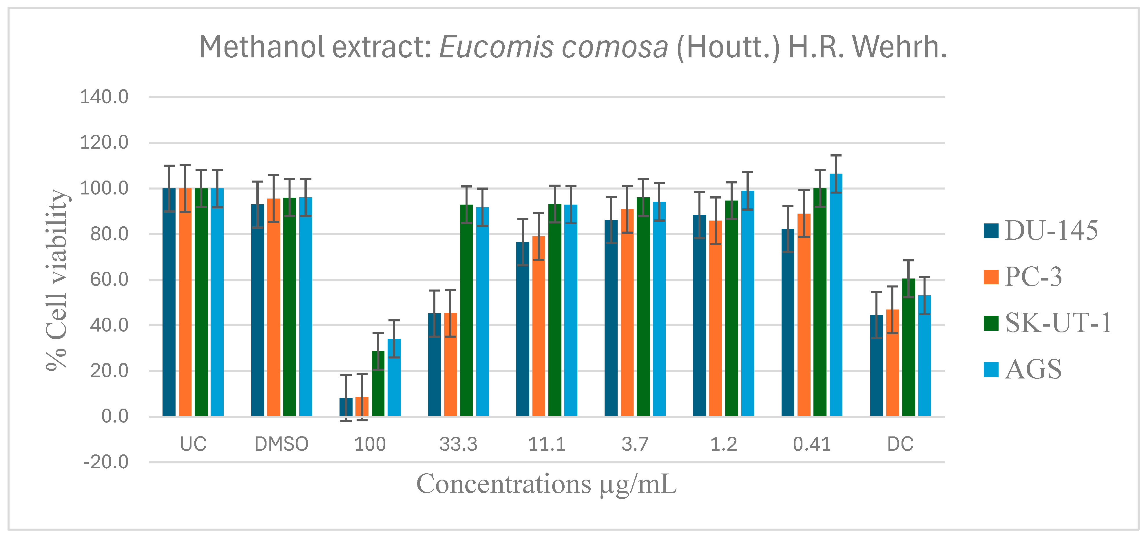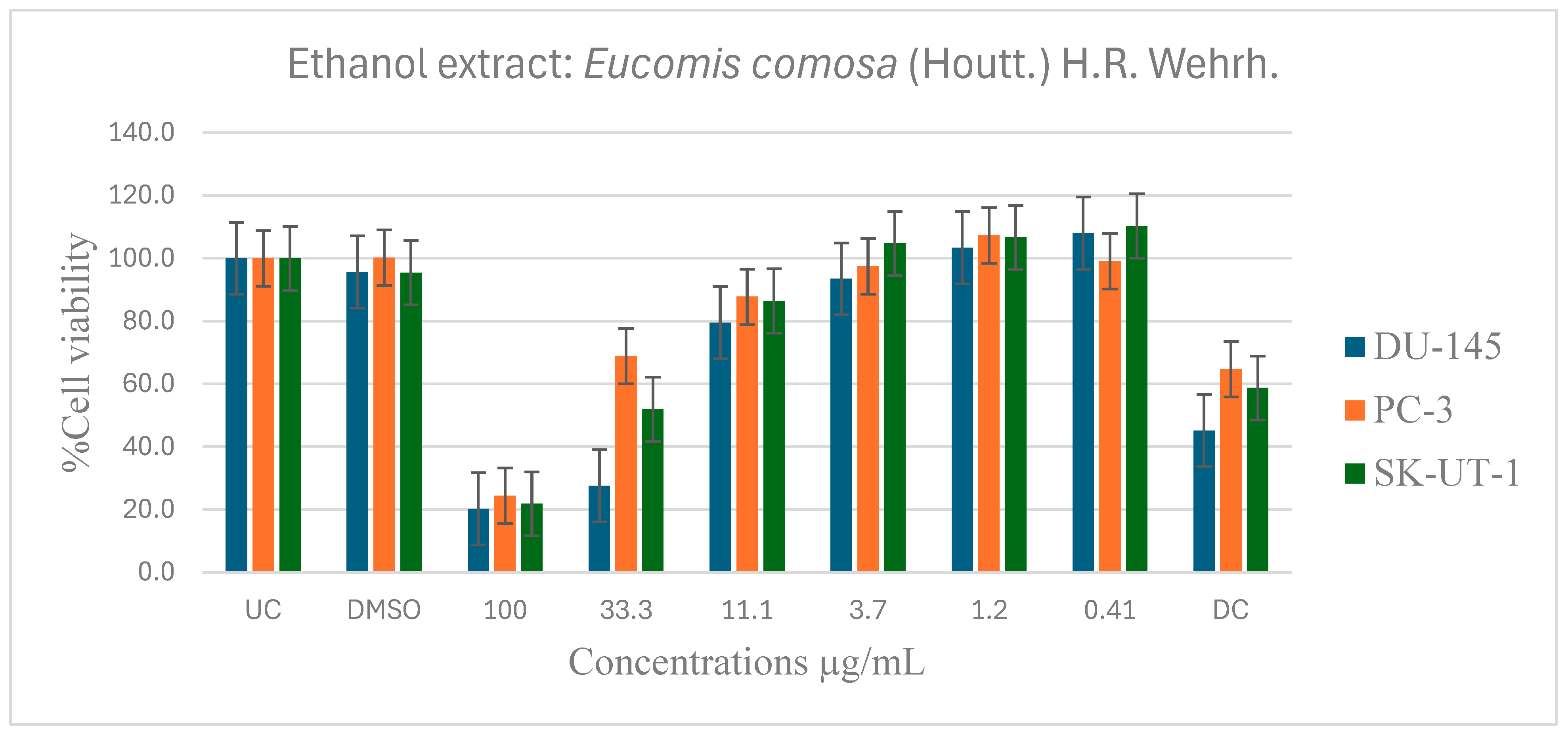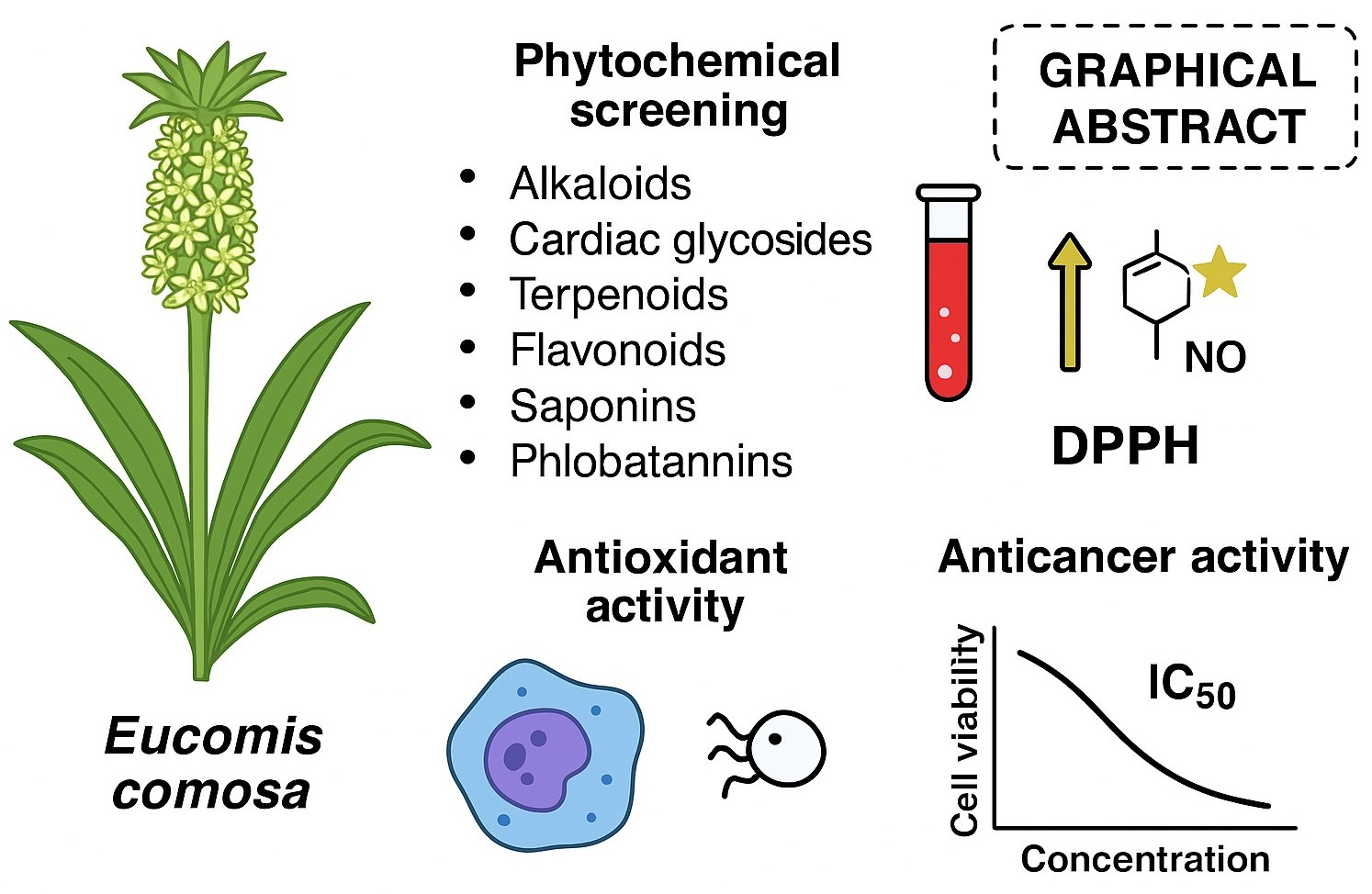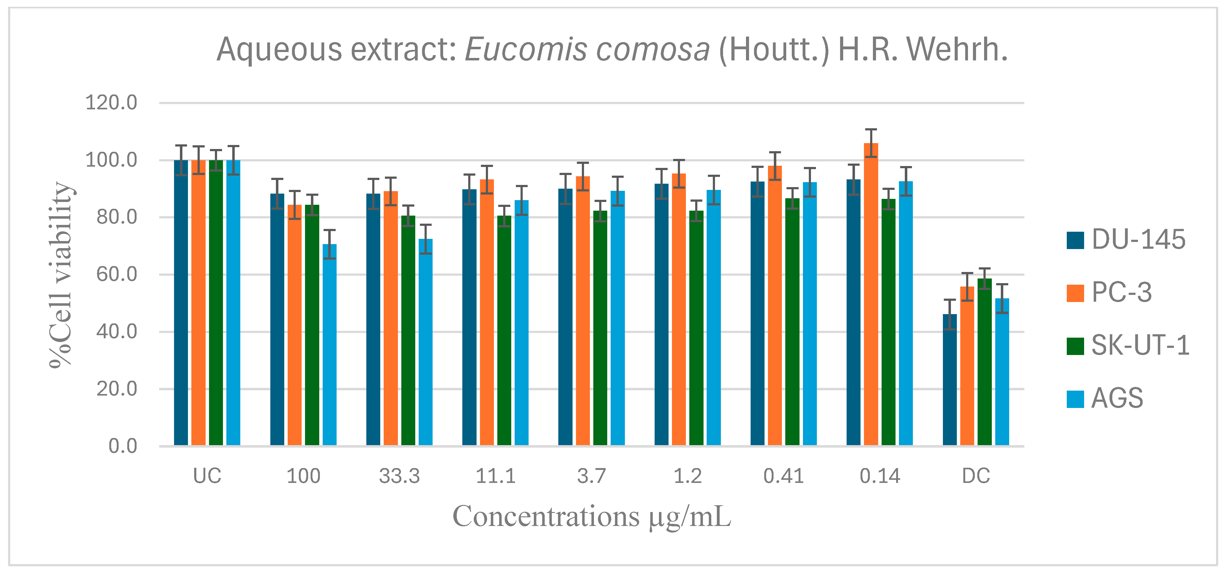 APA StyleBhanisa, T., Lamula, S. Q. N., Dambuza, A., Wium, M., Paccez, J. D., Zerbini, L. F., Bvenura, C., & Buwa-Komoreng, L. V. (2026). In Vitro Evaluation of the Anticancer and Pharmacological Activities of Eucomis comosa (Houtt.) H.R. Wehrh. Pharmaceuticals, 19(1), 104. https://doi.org/10.3390/ph19010104
