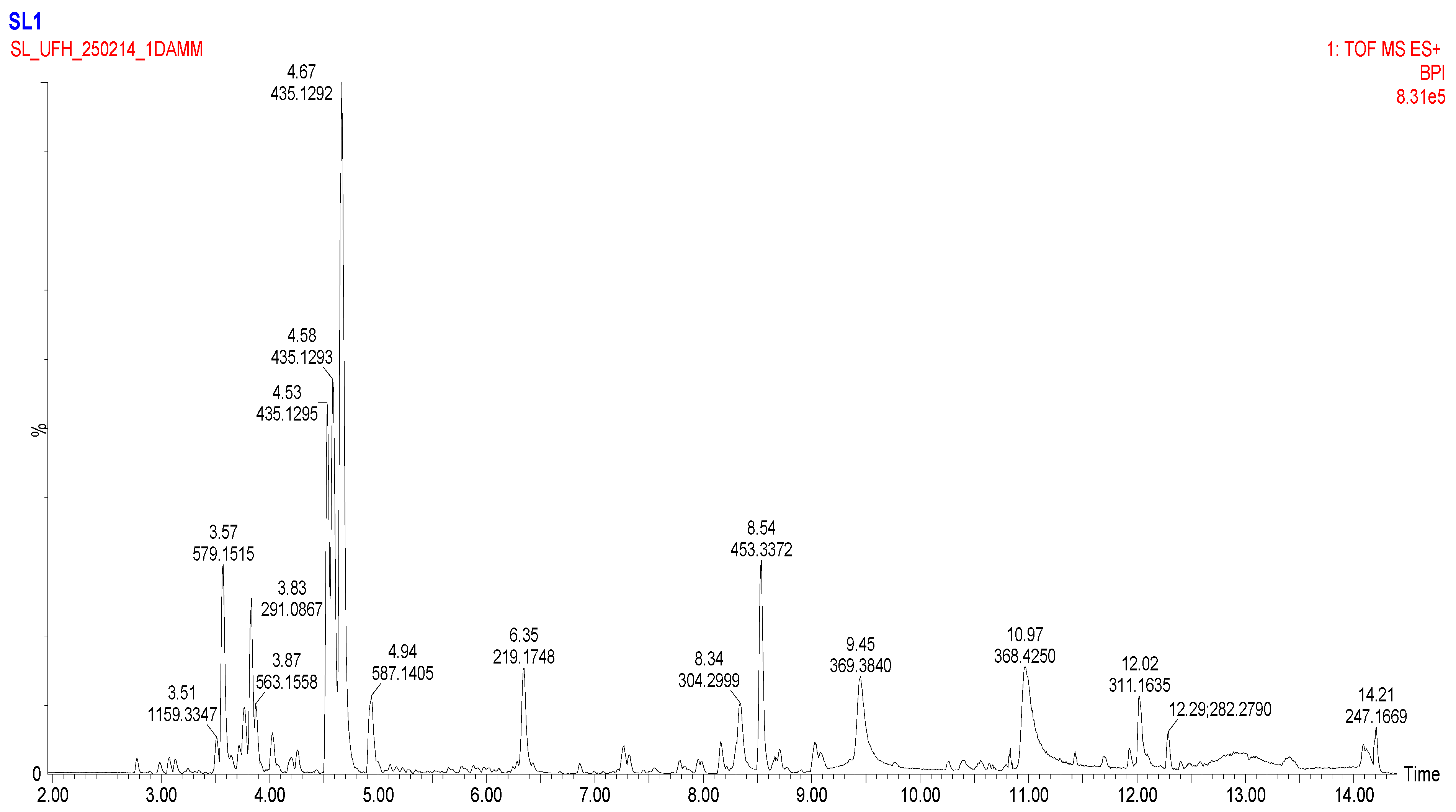| 6 | Phlorizin | C21H24O10 | 435.12970 | 435.12968 | −0.05 | 3.98 | 167.0347, 273.0768, 274.0846 | 2 | 4417 |