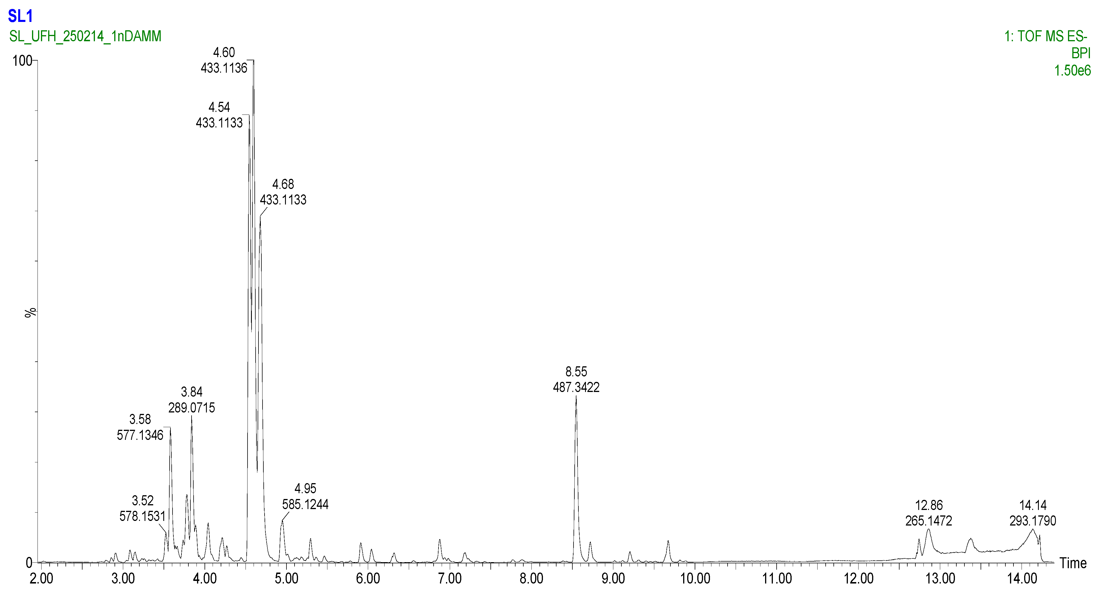 | 1 | (-)-Epicatechin | C15H14O6 | 289.07176 | 289.07176 | 0.00 | 3.83 | 109.0295, 123.0452, 125.0244, 145.0295, 245.0823 | 1 | 164,885 |