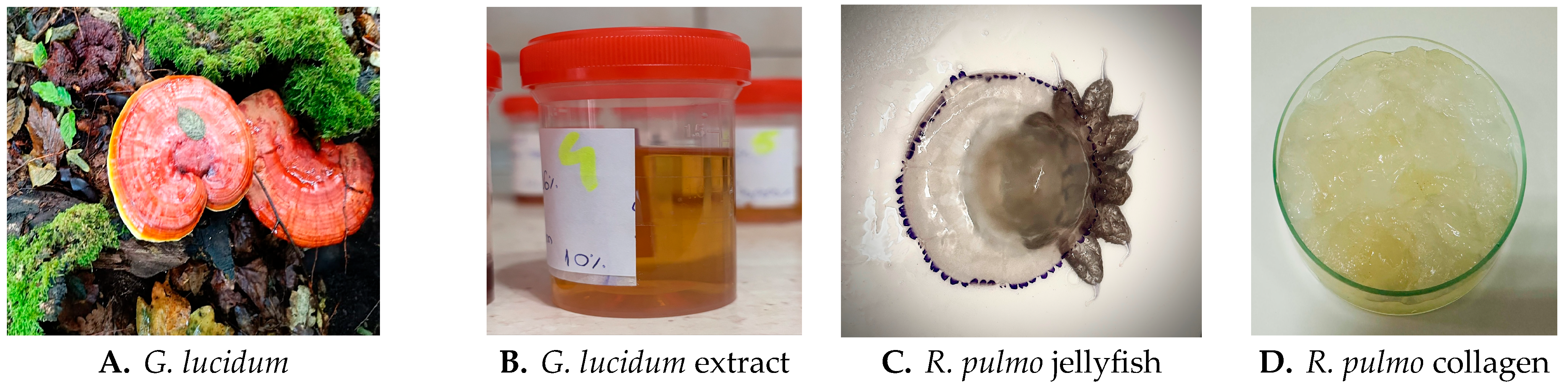 2.1. Chemical Profiling of Ganoderma lucidum Ethanolic Extract and Rhizostoma pulmo Collagen Hydrolysate